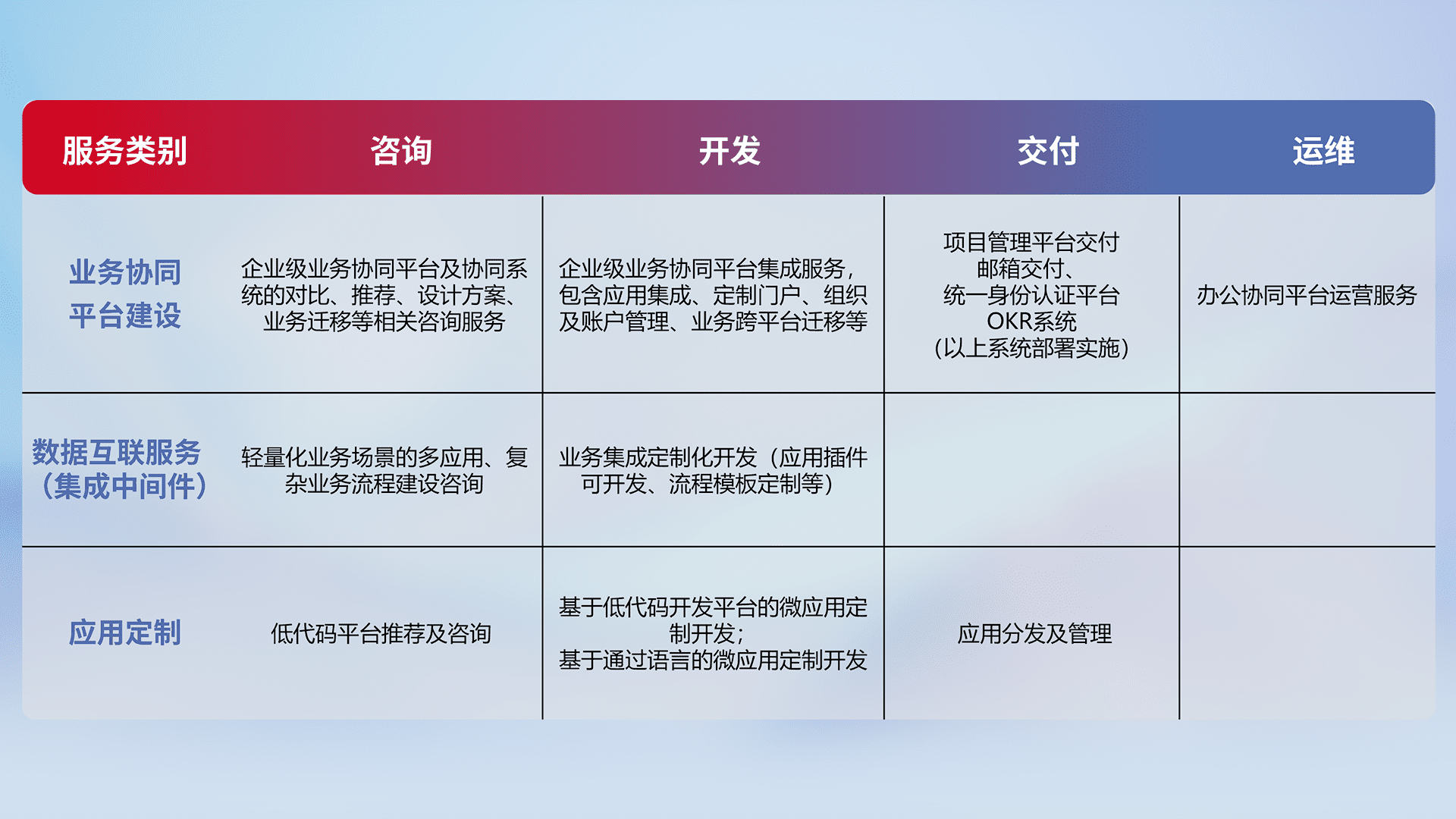 针对钉钉、、、、企微、、、IDaas等平台级产品提供产品的规划、、、、方案、、、交付、、、、定制化开发等服务,,实现如统一协同办公、、智能客户服务、、、、混合会议管理、、、智能数据查询、、、、等业务场景,,,实现数字化转型。。。