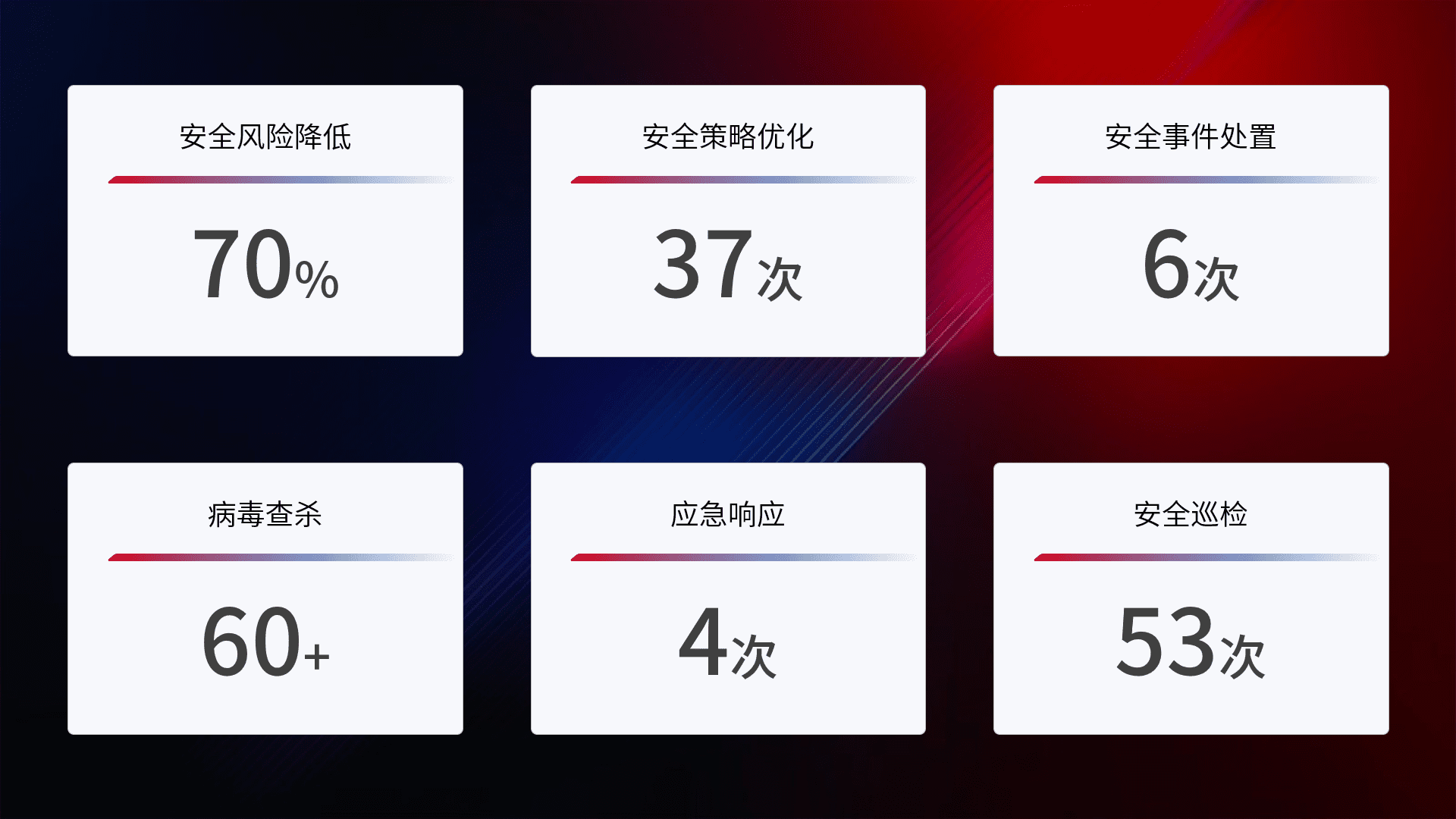 提供全面的安全事件报告体系,,包括处置报告、、、、周报、、季度和年度总结,,,,结合持续监控,,,,帮助客户深入了解网络安全状况。。。。