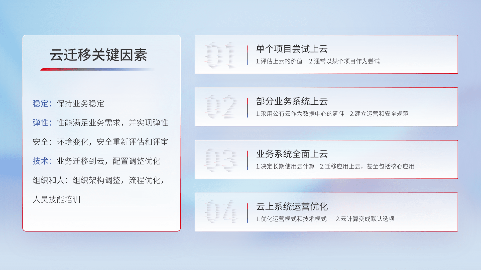 结合实际业务,,,,从规划设计、、、云平台选型、、云原生改造、、、、数据迁移、、、集成交付,,迁移全过程为客户识别最佳上云路径,,做好风险识别管理,,设计网络架构、、、身份权限、、安全审计合规、、操作审计、、、日志审计、、、监控告警策略、、、、多站点容灾设计等,,,,对云上基础设施进行整体规划,,,,提升IT治理水平,,以满足弹性、、、、高可用、、、、高性能的需求。。