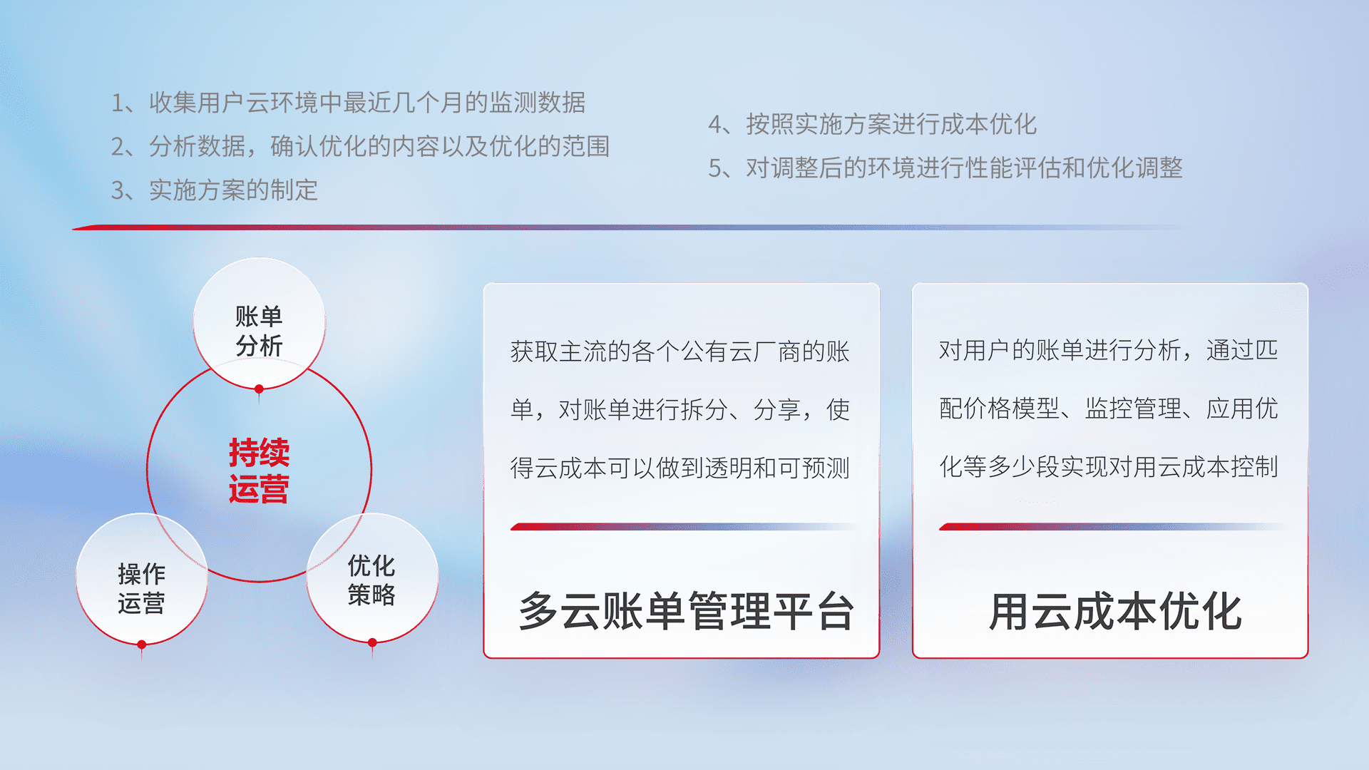 通过多云纳管,,,以统一的资源数据模型把客户的云资源进行抽象和封装,,,,进而实现对多云资源的统一操作,,保障云资源管理的可靠性、、稳定性与可用性。。量身定制化运维内容,,配置、、、开发运维、、、、补丁管理、、、、备份、、、监控、、、、认证和访问管理、、、审计和日常巡检等,,,保障在用云过程中的可靠度,,,,稳定度以及高可用率。。